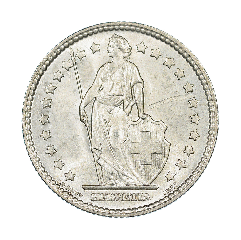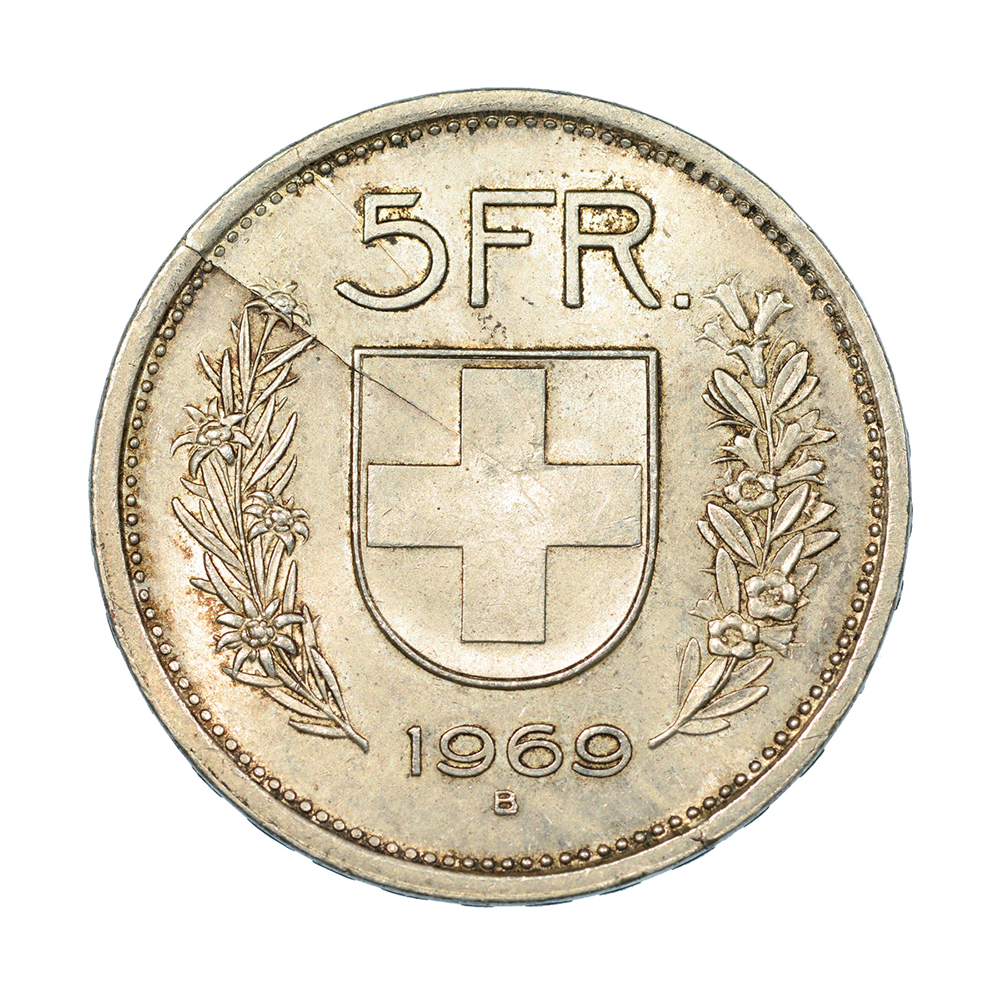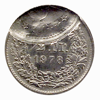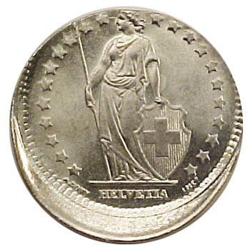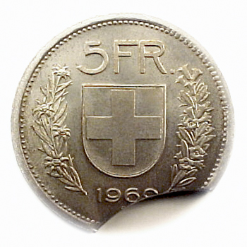 Beispiele dafür sind der ½ Franken 1946, 180° verdreht, der 10 Rappen 1970, 45° verdreht und der 5 Franken 1967, 40° verdreht.