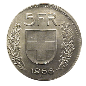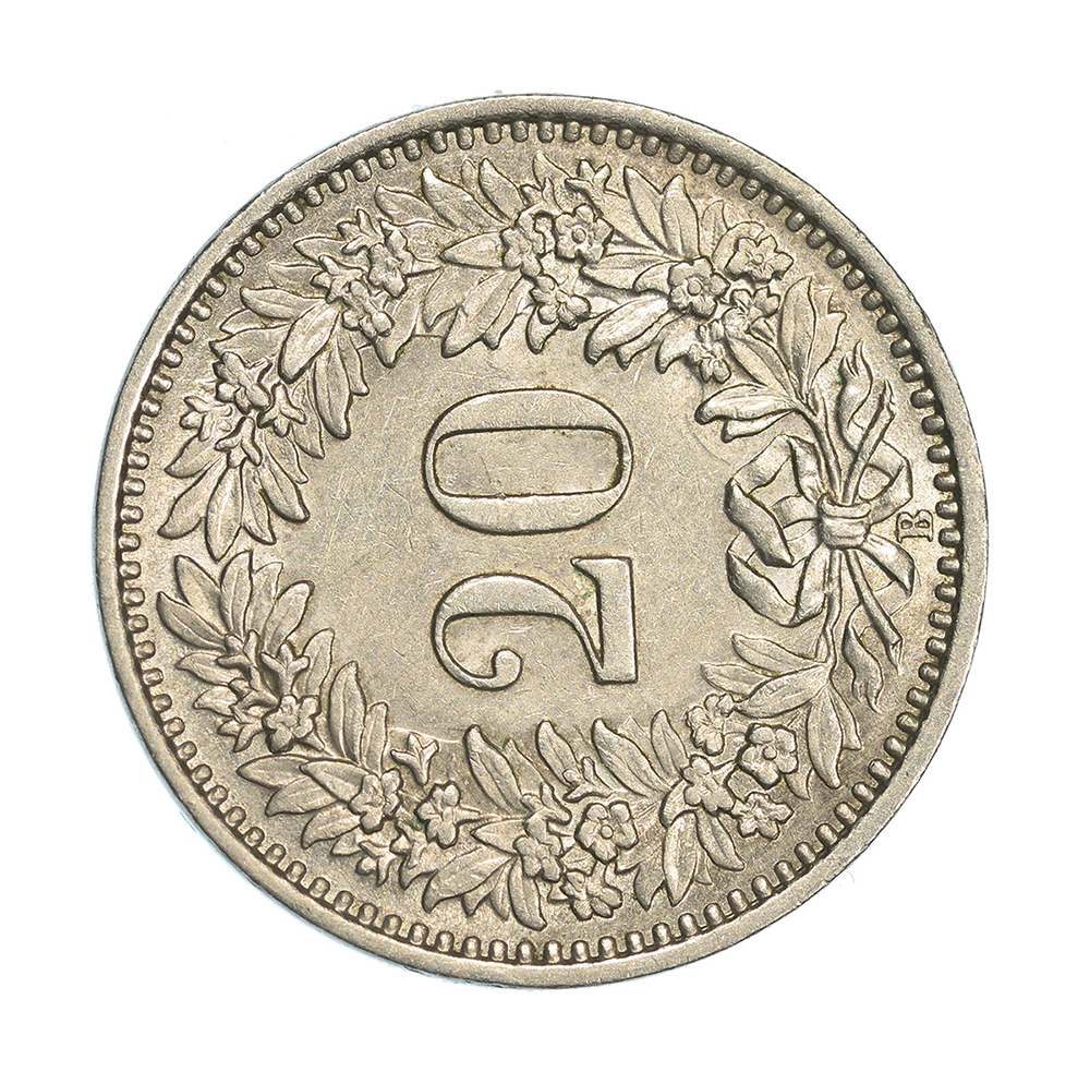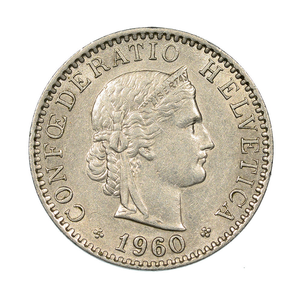 Beispiele mit verschiedenen Verdrehungen hierfür sind der 20 Rappen 1960, der 5 Rappen 1955 und der 5 Rappen 1963.